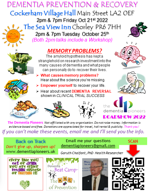 Memory problems? Come and find out how people are getting their memory problems sorted. We will discuss the recent clinical trial success in the states, and learn how to make dementia optional.