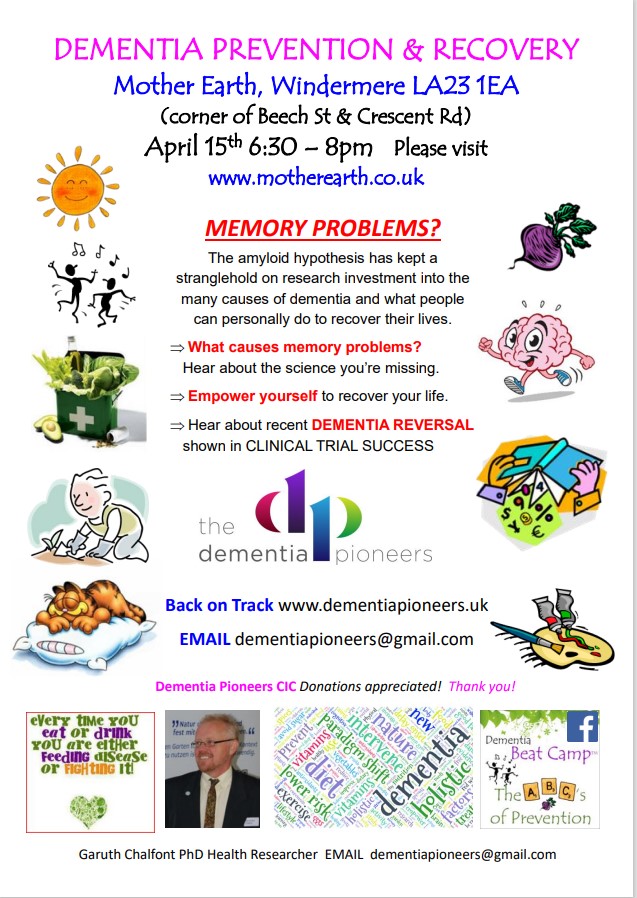 My talk will be delivered in a relaxed informal uplifting way with plenty of interaction between all of us. This latest research is indeed good news and not the usual depressing drivel about doom, gloom and decline and simply learning to ‘live with’ a supposedly ‘incurable’ disease. Come and hear what is possible using a multimodal lifestyle approach – and the first ever clinical trial showing remarkable recovery in 9 months from an Alzheimer’s diagnosis.