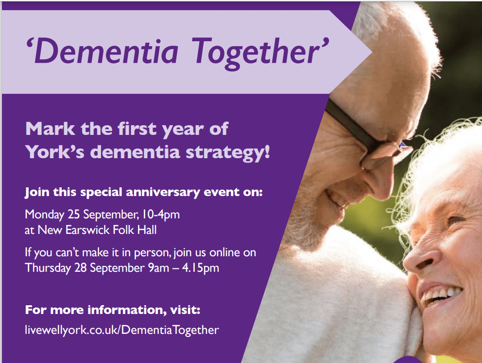 Helen and Garuth enjoyed conversations with partner organisations, presenters and visitors to the event on a beautiful autumn day in the historic planned village of New Earswick. Many thanks to all who took part and dropped by the Dementia Pioneers table to pick up information and chat about a possible new future for friends and loved ones.