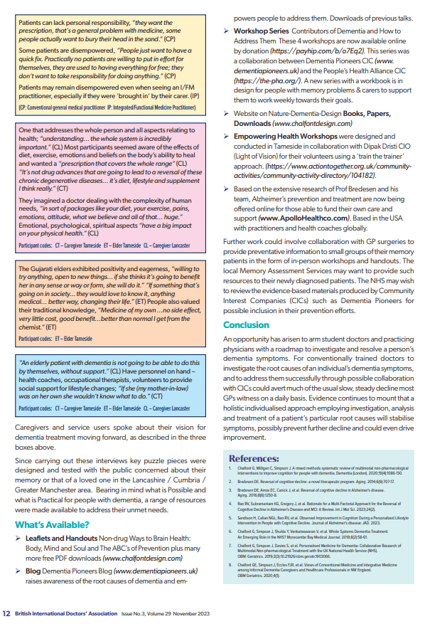 I am grateful indeed to the BIDA for publishing this paper which sets out a progressive and comprehensive agenda for further work in this field. I look forward to collaborating with local GP practitioners who are open to integrating Group Health Coaching sessions from the Dementia Pioneers CIC. Please reach out if you would like to have a conversation on this topic. I can be reached by email at dementiapioneers@proton.me.