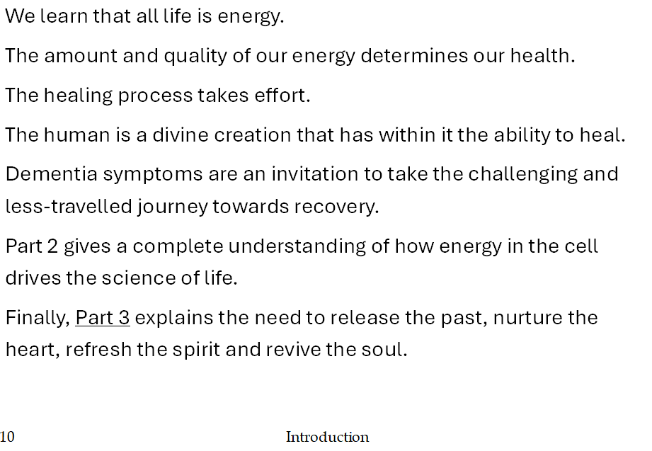 - Covers detox, diet & fasting, dental, sleep, vagus nerve, gut-brain connection, auras & halos, sunlight & firelight, structured water, red light, how water hears, feels and remembers, cymatics, the human biofield, sound healing, emotions & vibes, grounding, nature connection, Schumann resonance, electrical circuits in the body, acupuncture, German New Medicine, humming & chanting, relationships, meditation, prayer and belief, breathwork, God, spirit & soul, emotions & trauma, dementia as soul loss, soul retrieval, free will and purpose in life.